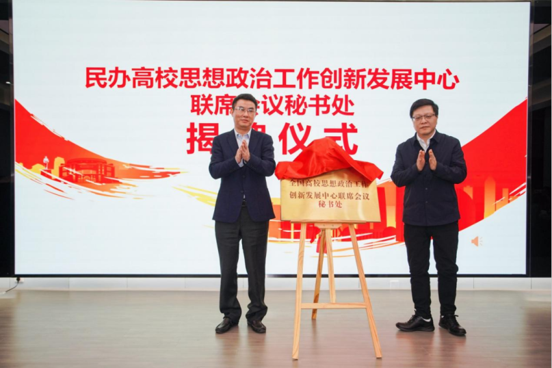 教育部思政司副司長余先亭和上海市教衛工作黨委副書記、上海市教委副主任、上海市民辦高校黨工委書記閔輝為民辦高校思政工作創新發展中心聯席會議秘書處揭牌