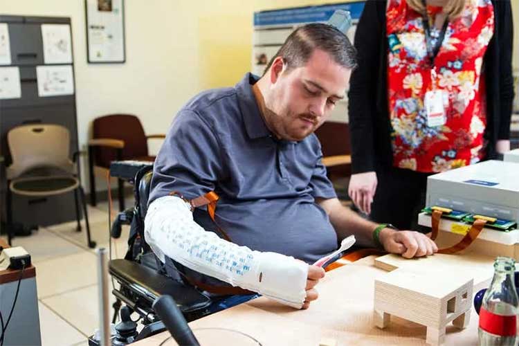 在2010年遭受嚴重脊髓損傷后,伊恩·伯克哈特在他的運動皮層植入了微型芯片,將大腦電信號轉到電腦上控制手臂,使其能夠再次抓住和感覺物體。圖源/Battelle Memorial Institute