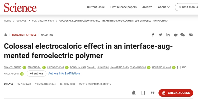 12月1日,上海交通大學機械與動力工程學院前瞻交叉研究中心錢小石教授課題組在Science上發表“Colossal electrocaloric effect in an interface-augmented ferroelectric polymer”的論文,開發了一種高分子拓撲界面外延技術,通過小分子晶體犧牲層誘導高分子極化界面的廣泛形成,使得鐵電聚合物在外界電場作用下展現出巨大熵變,在傳統的偏氟乙烯基弛豫鐵電高分子中實現了龐電卡效應,并揭示了拓撲外延的極化界面在外加電場調控下的熵變機理。錢小石教授為本文唯一通訊作者,博士生鄭珊瑜為論文第一作者。這是錢小石課題組本年度第二次以第一作者單位在Science上發表論文。