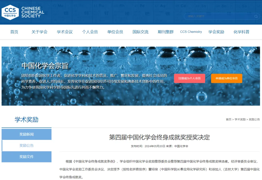近日,中國化學會決定授予(按姓名拼音排序)董紹俊(中國科學院長春應用化學研究所)和徐如人(吉林大學)第四屆中國化學會終身成就獎。