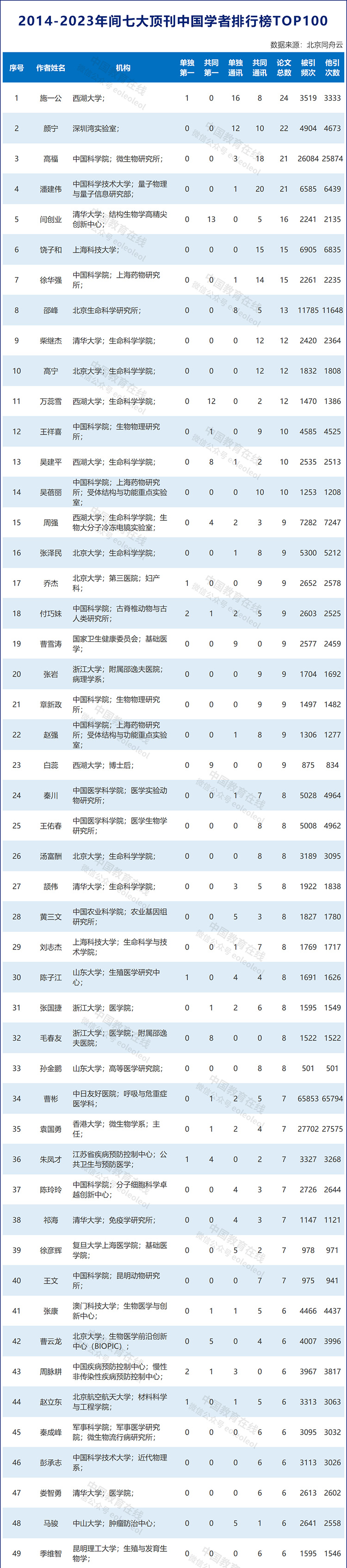 施一公第一、顏寧第二!2014-2023七大頂刊中國學者排行榜TOP100出爐