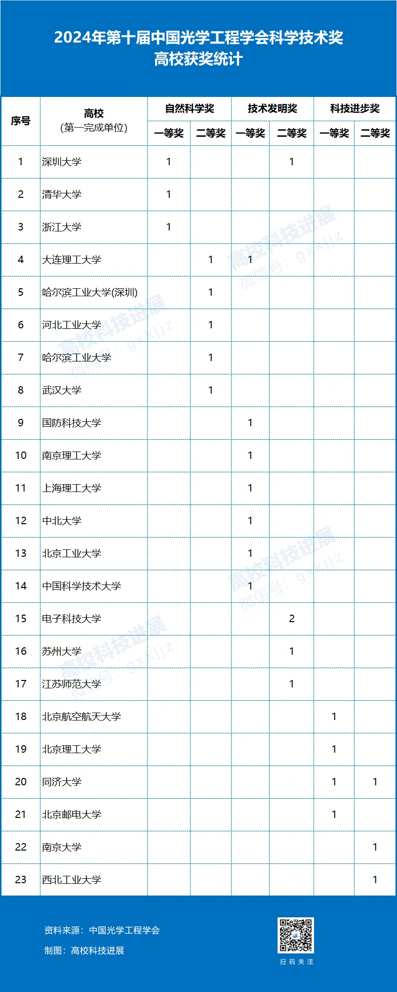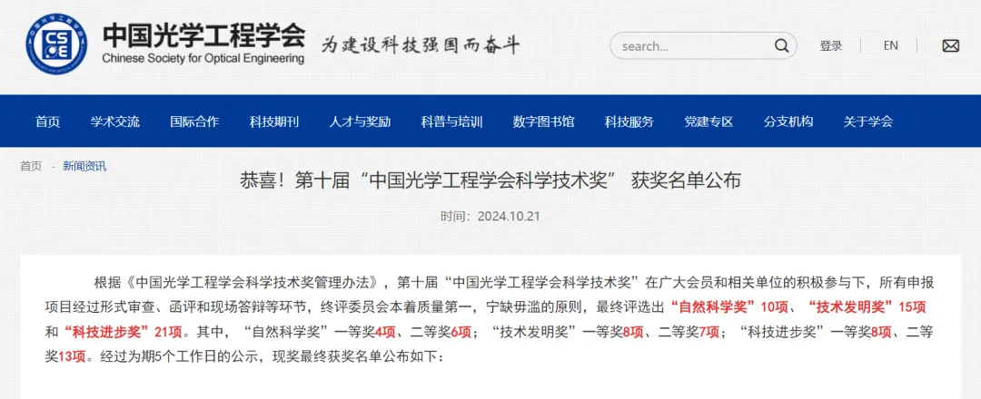 日前,2024年第十屆中國光學工程學會科學技術獎獲獎名單正式公布,最終評選出“自然科學獎”10項、“技術發明獎”15項和“科技進步獎”21項。其中,“自然科學獎”一等獎4項、二等獎6項;“技術發明獎”一等獎8項、二等獎7項;“科技進步獎”一等獎8項、二等獎13項。