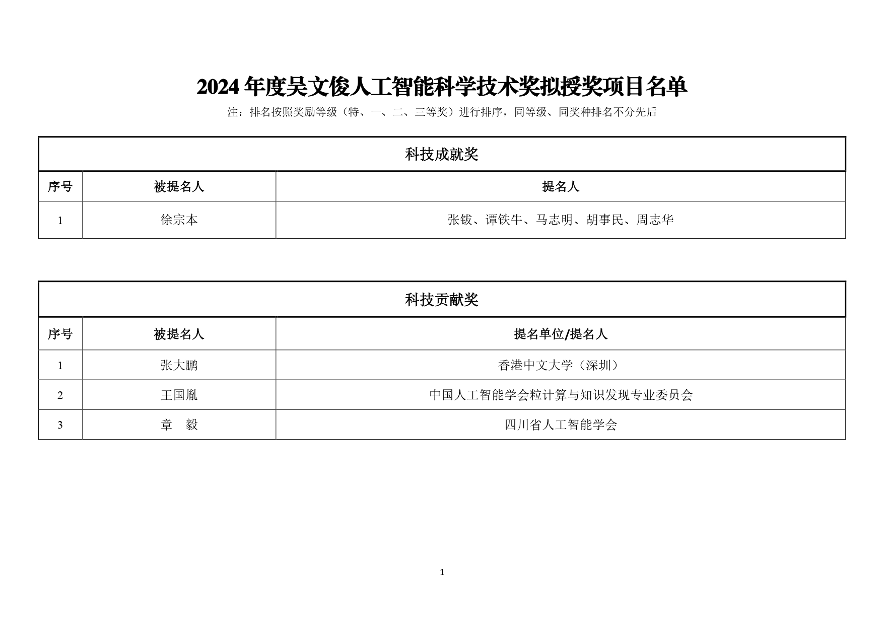 1月15日,中國人工智能學會公示2024年度吳文俊人工智能科學技術獎擬授獎項目名單。名單顯示,徐宗本院士獲科技成就獎提名,張大鵬、王國胤、章毅獲科技貢獻獎提名。此外,自然科學獎9項,技術發明獎8項,科技進步獎17項,青年科技獎15人。據統計,共有21所高校作為第一完成單位入選。