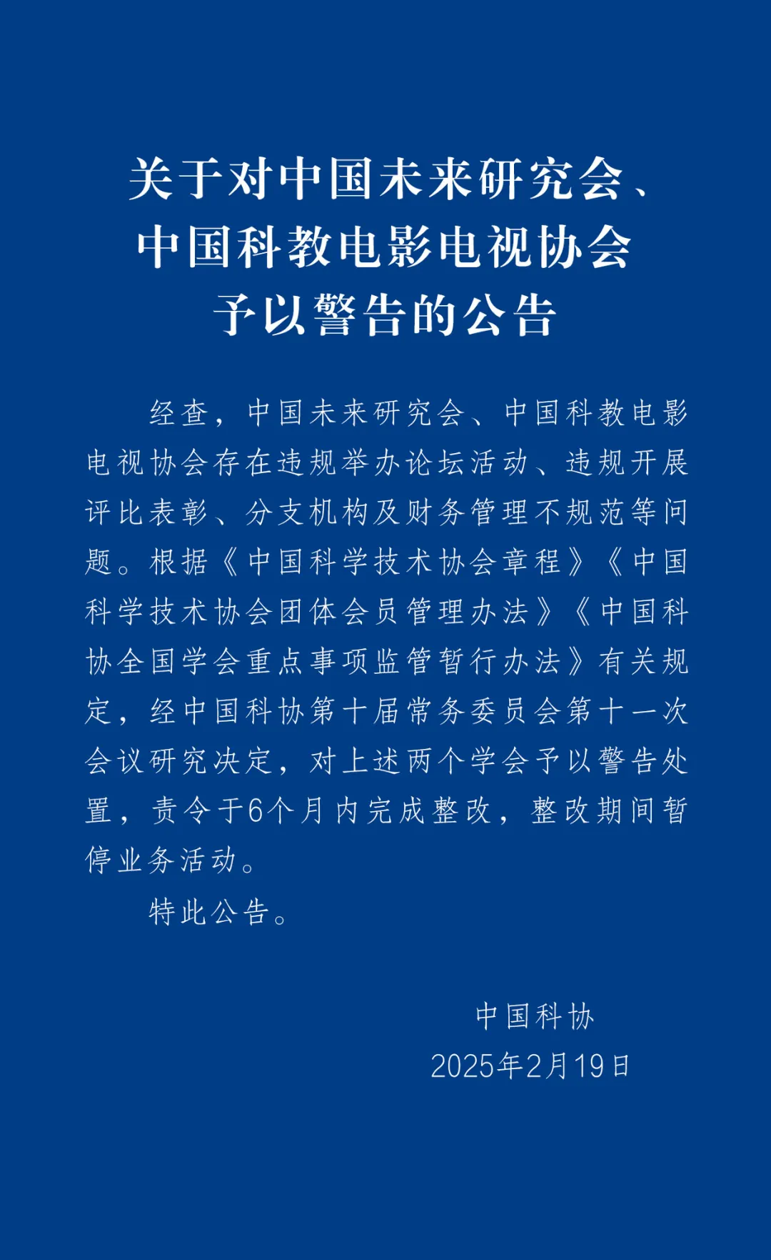 中國科協:對中國未來研究會、中國科教電影電視協會予以警告