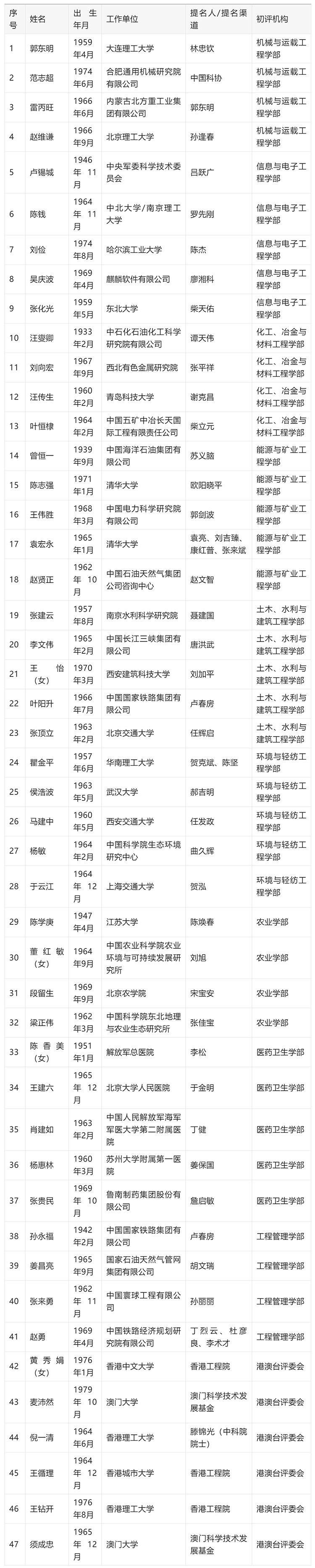 中國工程院公布第十六屆光華工程科技獎初評候選人名單