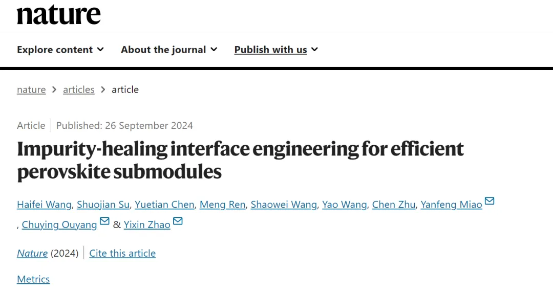 近日,上海交通大學環境科學與工程學院趙一新教授團隊在Nature發表了題為“Impurity-healing interface engineering for efficient perovskite submodules”的研究論文。該工作設計開發了一種雜質修復的界面工程新策略,解決了工業化大規模制備鈣鈦礦模組中面臨的大面積引發雜質累積效應的關鍵科學問題,并和寧德時代21C創新實驗室合作,成功實現了光電轉換效率超過22%的30 cm × 30 cm大尺寸高性能鈣鈦礦光伏模組。