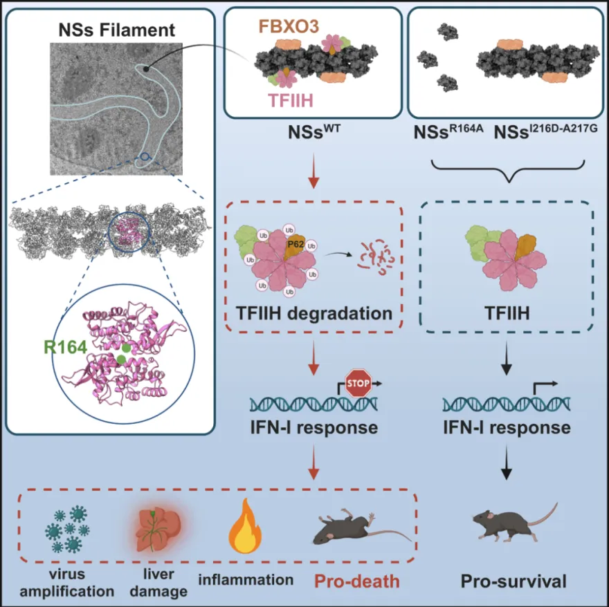 文章模式圖:NSs蛋白重塑的FBXO3-NSs filament介導TFIIH復合體降解,系統性拮抗宿主IFN-I反應,促進RVFV感染致病