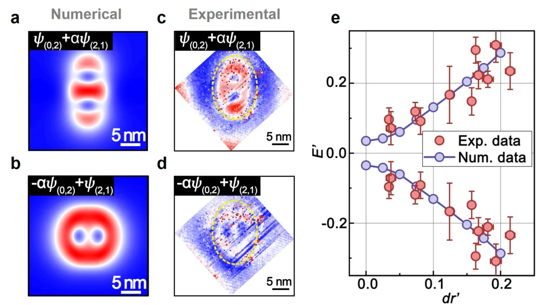 該研究指出,如果在石墨烯量子點中將圓形勢場變形為橢圓形勢場,軌道量子數為0的s軌道和軌道量子數為2的d軌道之間將會發生雜化,重新組合成兩個新的雜化態。孫慶豐教授課題組從解析推導和數值計算兩方面得到了雜化態的形狀(圖2a,b,θ形和倒θ形)。何林教授課題組在實驗上利用掃描隧道顯微鏡(STM)針尖操縱技術,開發了制備具有不同各向異性程度量子點的方法,并對其中的受限態進行了系統探測,直接觀測到了量子點受限態的軌道雜化特征(圖2c,d)。