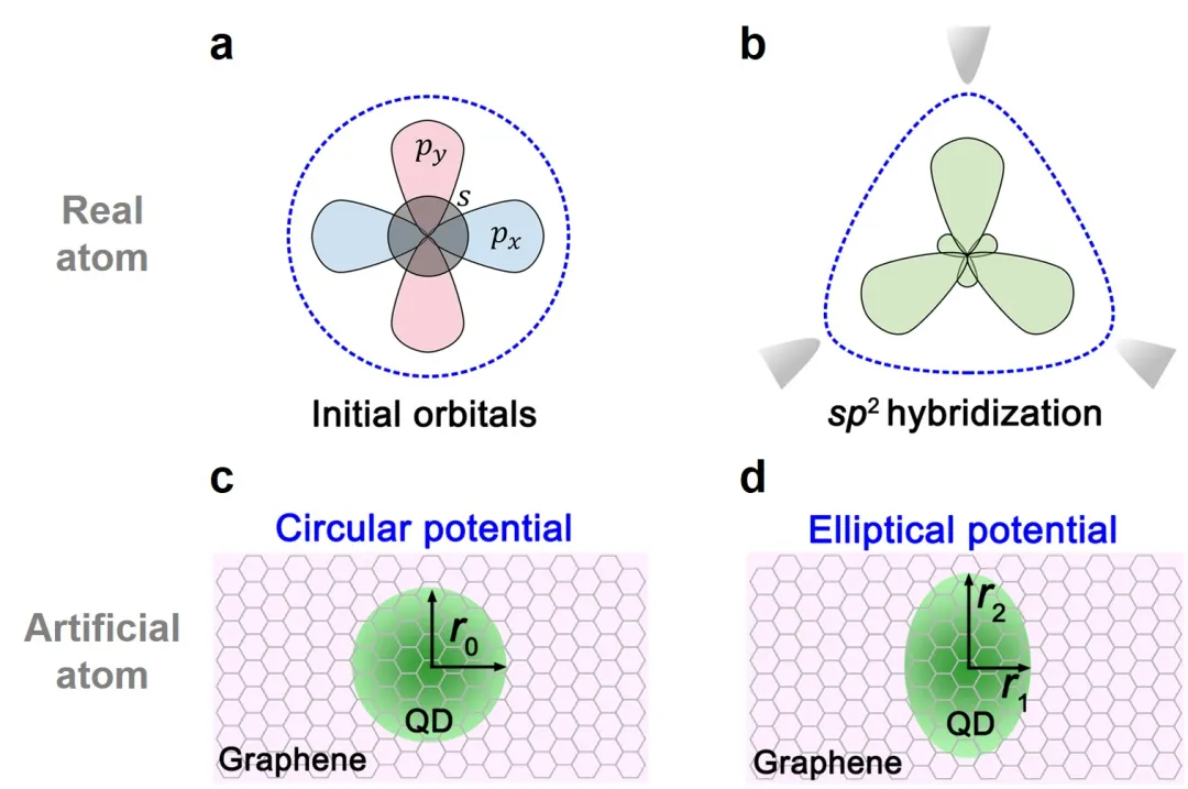 針對這一空白,何林課題組與孫慶豐課題組深入合作,發展了人造原子中軌道雜化的概念,提出人造原子的各向異性勢可以讓其能量相近的不同軌道受限態之間發生雜化(圖1)。