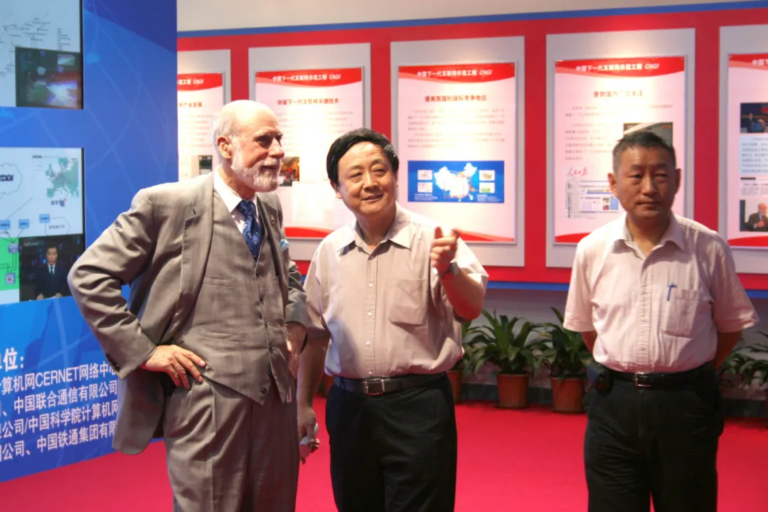溫頓·瑟夫(左)曾多次訪問清華大學并與校內專家交流互聯網技術,這是他訪問期間和吳建平(中)、李星(右)在一起